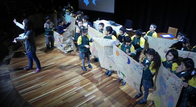 Mientras Ángeles y Fernando contaban las historias, Verónica dibujaba en su notebook para que los asistentes pudiesen ver, proyectado en un telón, el proceso de crear una ilustración. Todos escuchaban con atención mientras miraban a Vero trabajar. Al final de cada taller, quienes participaron debieron presentar sus dibujos sobre el escenario (como los niños en la foto de arriba).