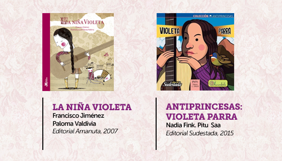 Con los años, la literatura infantil y juvenil comenzó a involucrarse en esa tarea: figuras como la destacada folclorista chilena se hacían más presentes en los relatos para niños, facilitando el proceso de familiarizarse con su incidencia en la historia país. En 2009 la colección Mi Historia de Amanuta incluyó el relato La niña Violeta, escrito por Francisco Jiménez e ilustrado por Paloma Valdivia. El cuento aborda la vida de Violeta Parra, desde su infancia hasta su fallecimiento, dando espacio a distintos hitos de su historia. La obra es narrada en un tono poético, que hace amable su lectura, y es acompañada por una serie de ilustraciones que bien se aúnan al relato. Uno de los méritos que más destaco en este trabajo es la honestidad de la propuesta, que no omite los episodios más difíciles en la vida de la folclorista.