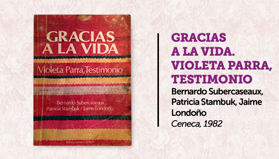 Entrevisté a quien fue su nuera, Marta Orrego, mujer de Ángel Parra y madre de Javiera y Ángel; también a su amiga Frida Sharim y a otra muy cercana, cuyo nombre no recuerdo, con quien conversé largo rato en una casa de piedra y madera, llena de flores, cerca de Avenida Egaña. Como guía y fuente documental me acompañó un libro, en ese entonces recientemente publicado, editado en 1982 por Granizo-Ceneca: Gracias a la Vida. Violeta Parra, testimonio, de Bernardo Subercaseaux, Patricia Stambuk y Jaime Londoño. Es un valiosísimo texto en que la vida de Violeta es narrada cronológicamente en la voz de sus cercanos.