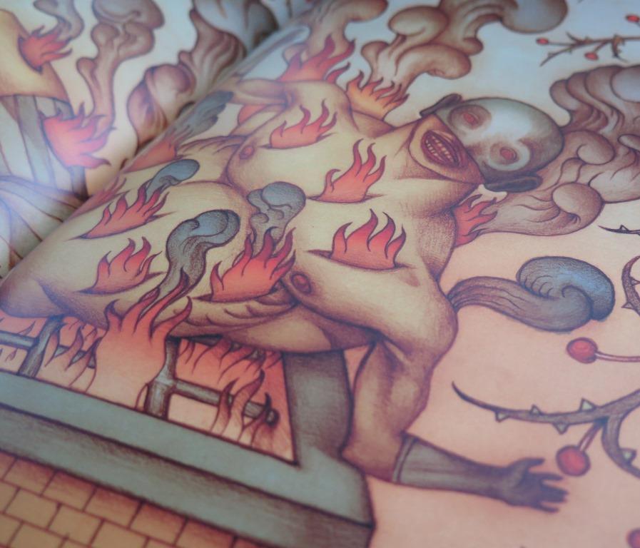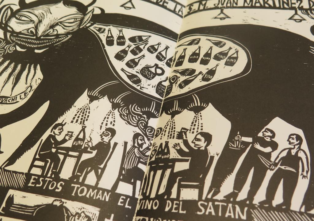 —Lo hice en 1999, cuando hacía grabados. Tiene distintas historias, todas ficticias. Lo hice a mano, a pulso. Era un libro xilográfico, hecho con prensa y tintas. Este libro es pura imagen, hasta los textos son dibujos. Con mi señora lo imprimimos, lo cosimos, lo doblamos y lo convertimos en libro. En esa época era más deportivo, tenía más energía. Todavía me encanta la xilografía, pero ya estoy más viejito. Fue un hecho portentoso hacer ese libro. Hicimos sólo ocho copias. Fue Daniel Blanco Pantoja, de la editorial Erdosain, el que me insistió en que ese libro había que hacerlo en edición grande. Él se encargó de digitalizarlo y editarlo.