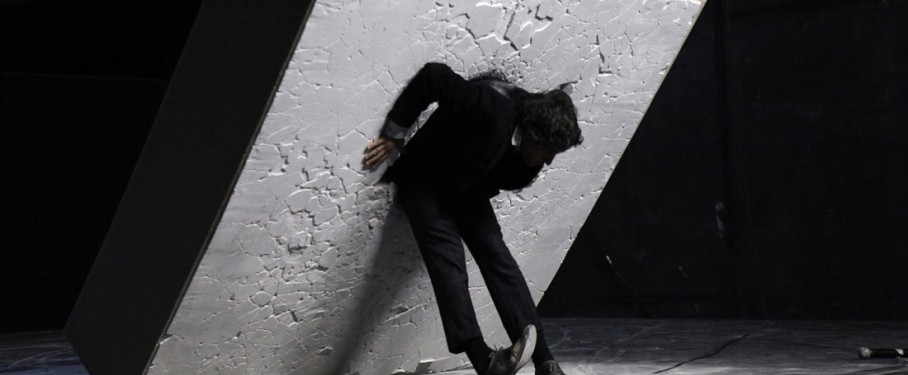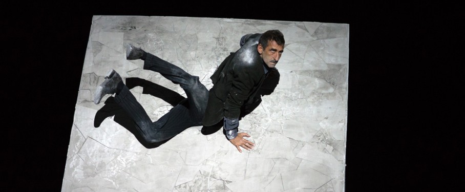 El escenario es sombrío, y nos espera incluso antes que el público acalle su ruido y se de por iniciada oficialmente la obra. Es el mismísimo Dimitris Papaioannou quien nos observa antes que nosotros nos demos cuenta que siquiera está ahí, sentado en el aire con una piedra en la mano. El cielo demarca un espacio de tinieblas, un espacio donde visualizamos esa montaña donde la piedra rueda y que es el camino constante de Sísifo. Es además, un peso sobre las cabezas, un cielo imponente donde de alguna forma podemos imaginaros a los dioses dictando su furia contra Sísifo que creyó vencerlos.