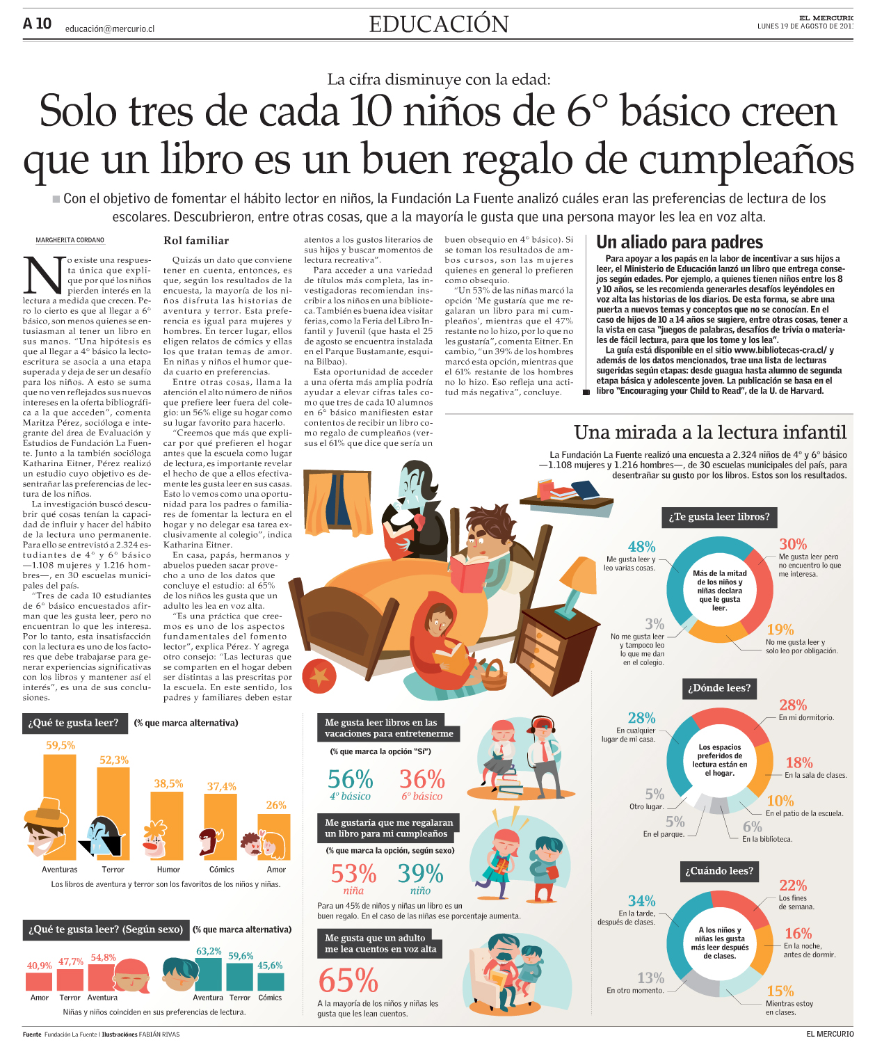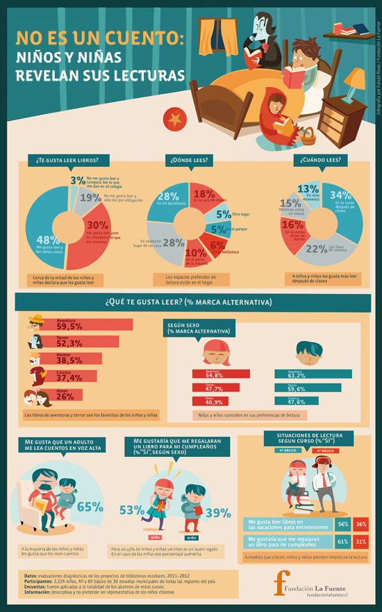 Nuestra fundación ha realizado un estudio donde los propios niños relatan sus preferencias lectoras. Fueron encuestados 2.324 estudiantes de 4° y 6° básico de escuelas municipales chilenas de todo el país. Parte de los descubrimientos: que los niños prefieren leer en sus hogares antes que en la escuela; que les gusta que les lean cuentos; que los libros de aventura y terror son sus favoritos y que a medida que crecen, pierden interés en la lectura.