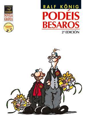 Quizás la escena con que se cierra Podéis besaros es la mejor forma de representar lo dicho: tras la lucha en Alemania por el matrimonio igualitario y tras años de relación, Konrad y Paul aparecen vestidos de frac para dar el sí ante un narigón empleado del registro civil. La lucha de años por la equidad parece llegar a su fin para estos personajes. Pero recogiendo el cliché de una mala teleserie, a último momento y cuando solo les resta dar el “sí, quiero”, desisten. “Lo que pasa es que… hace quince años que vivimos juntos y… en lo referente al cariño y al cuidado, no necesitamos que nadie nos enseñe. ¡Y en el fondo no necesitamos la bendición del Estado para eso!”, explica Konrad ante una sorprendida concurrencia de familiares y amigos. Así, en un mundo en el que paulatinamente se impone una nueva imagen del gay, Ralf König rompe una vez más con ella y rescata a sus personajes como seres humanos que han construido su propia forma de vivir una relación. Ya solos luego de la ceremonia frustrada, Konrad y Paul reconocerán el cariño que los une. Pese a que como estereotipos opuestos su relación parezca un chiste.